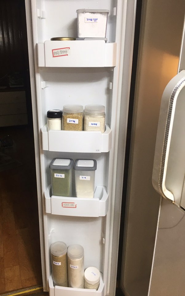 매일 쓰는 국그릇, 밥그릇, 접시를 수납도구 사서 핑거존에 배열하다. 2층은 손이 안까지 안 닿아 바구니에 물건을 담아 라벨을 붙이다. 바구니만 꺼내면 물건 꺼내기 쉬워진다. 우유곽을 ㄱ모양으로 잘라 공간을 구분해주다. 물건이 다양해 칸 모양도 다양하다. 하부장에 선반을 단 씽크인 선반을 처음 배우다. 밖에 두었던 채반도 쏙 들어가고, 늘어놓았던 병들도 쇼핑백 접어 여러개를 수납했다. 컵은 왼쪽으로 갈수록 큰 사이즈로, 한 줄에는 같은 크기로 꺼내기 쉽게 배열. 봉다리에 담아 둥글게 뭉쳐 보관하던 가루들을 선반전용 통에 담아두다. 가루종류가 많고, 부침가루 2개, 감자전분 3개 등 겹치는 것도 많았다. 냉장고는 대공사였다. 냉장고 뒤에 검은 먼지까지 닦아 내고, 물건을 모두 꺼내 봉다리 담아둔 가루를 통으로 옮겨 담았다. 가루외 목이버섯, 삶은콩과 팥 등은 지퍼백에 담아 수평으로 평평하게 한 후 얼려서 책처럼 세워 수납했다.