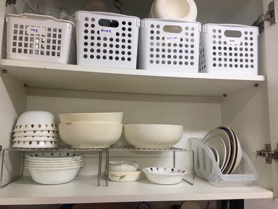 내가 살고 있는 원룸은 살림이 그다지 많지 않아, 수납도구 몇개 사서 정리했다. 고레벨 도전을 위해 엄마의 부엌으로 갔다. 먼저 물건 꺼내고 버리기. 희안하게 자주 쓰는 물건은 오래돼고 낡은것이며, 다른 수납장에 예쁜 그릇이 숨겨져 있었다. 핑거존(손이 잘 닿는 곳)에 매일 써야하는 물건이 있어야하는데, 잘 쓰지도 않은 컵들이 자리를 차지하고 있었다. 모두 꺼내서 매일 쓰고, 상태 좋은것만 추리고 다 버리자고 했다.